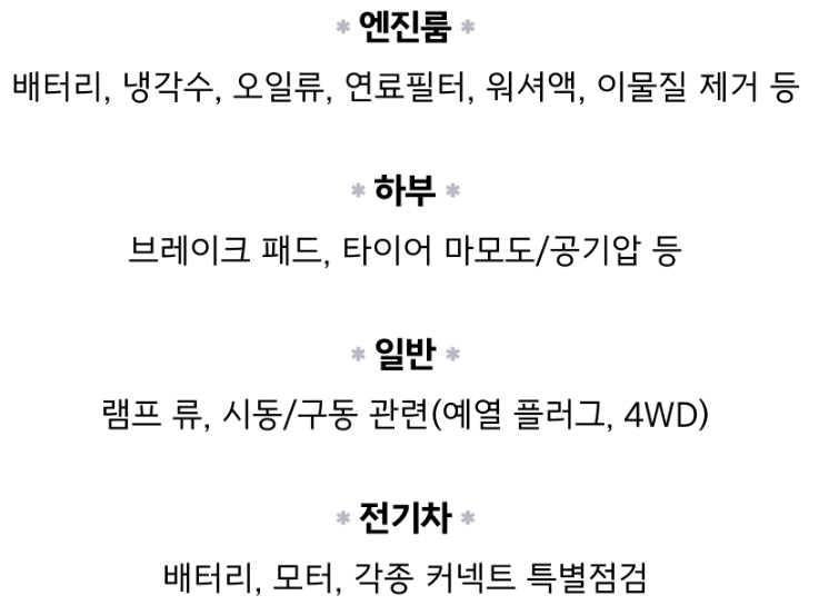 이번 설 특별 점검은 ▶기본항목(브레이크 패드·공조장치·타이어·등화장치) ▶ 엔진룸(오일류·냉각수·워셔액·배터리) ▶ 전기차(냉각수 및 고전압 배터리) 등으로 구성돼 있는데요. 점검을 마친 고객에게는 부가 서비스로 워셔액을 무상 지급한다고 하니 꼭 무상 점검 정비소에 들리셔서 서비스 받으시기 바랍니다.